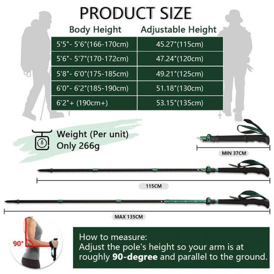 콤비네이션 락 시스템을 채택한 이 트레킹폴은 퀵락과 트위스트락을 결합하고, 트위스트락 부위에 충격 방지 스프링이 내장되어 있어 손상 충격을 덜 받고 에너지를 사용하면서 더욱 빠르고 빠르게 이동할 수 있습니다. 높이 조절이 가능한 워킹 폴은 대부분의 사람들에게 적합합니다. 게다가 명확한 눈금이 있는 트레킹 폴과 25"에서 53"까지 확장할 수 있는 스톱 팁이 있습니다. 가능한 한 작고 가볍습니다. 짧은 높이에서 높이까지 모든 높이에 적합합니다. 키가 큰 남자, 여자, 심지어 어린이까지! 초과하지 않도록 주의하세요.