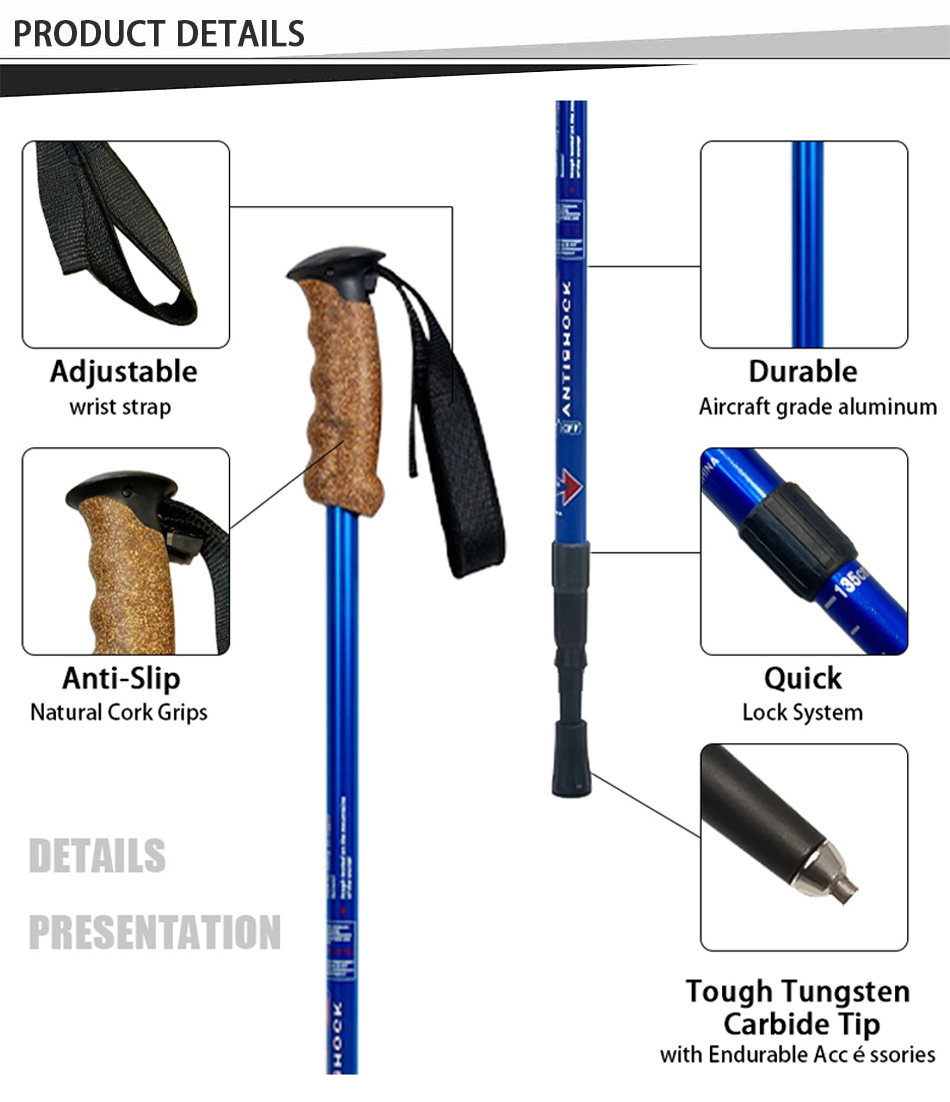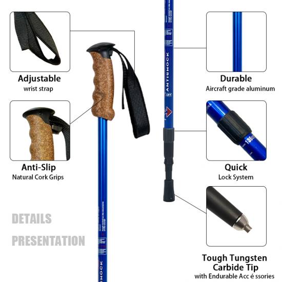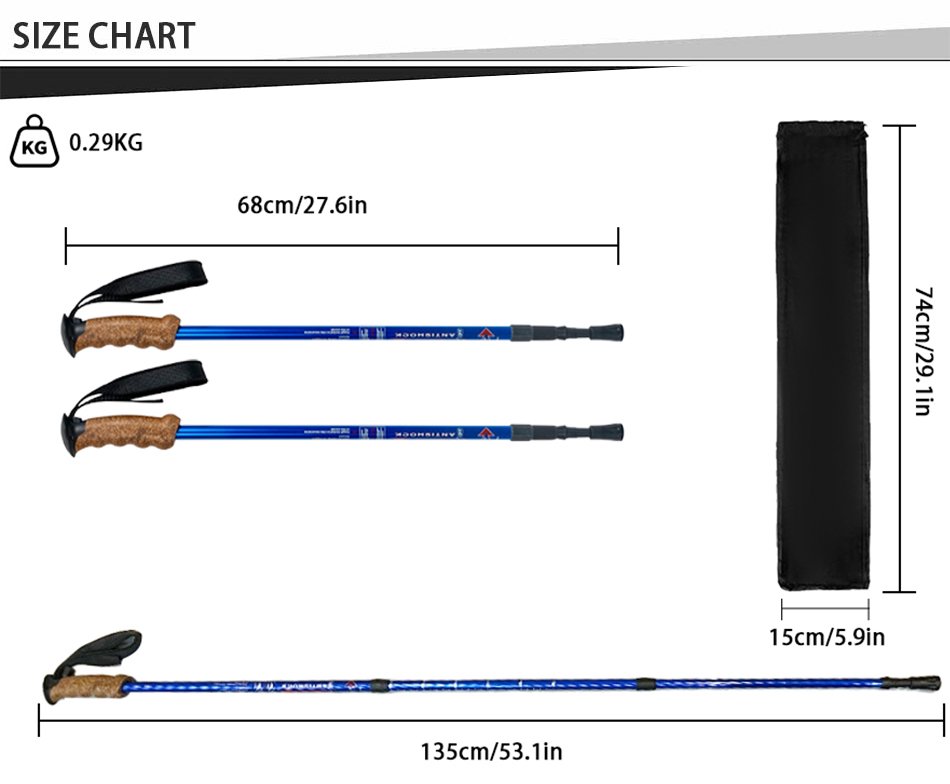 제품 : 내구성이 뛰어난 7075 알루미늄으로 제작된 조절식 등산 스틱은 가볍고 접이식 디자인, 빠른 잠금 장치, 인체공학적 그립, 그리고 트레킹, 등반 및 야외 활동에 필요한 안정적인 지지력을 제공합니다.