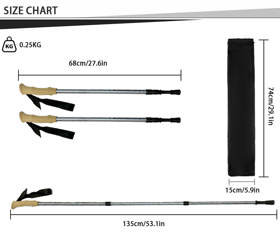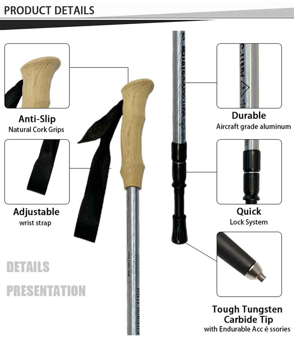 제품 : 알루미늄 소재의 텔레스코픽 아웃도어 트레킹 폴은 인조 코르크 그립, 북유럽식 충격 흡수 디자인, 길이 조절 기능, 그리고 가볍고 내구성이 뛰어난 특징을 갖추고 있어 하이킹과 야외 산책 시 안정적이고 편안한 지지력을 제공합니다.