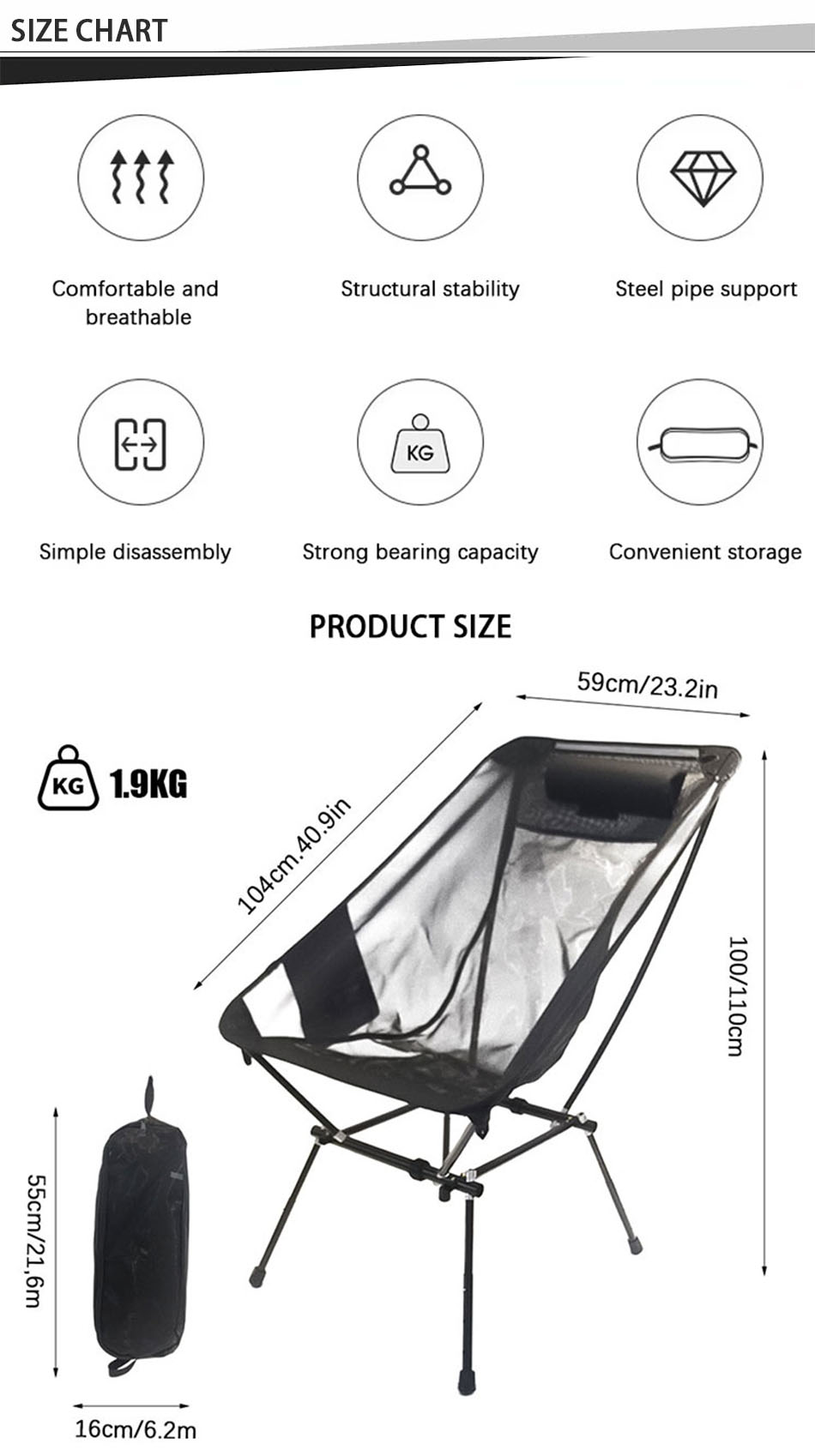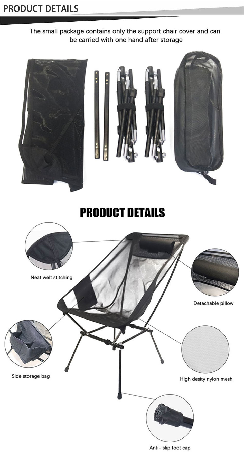 제품 : 이 캠핑 피크닉 블랙 나일론 메시 경량 금속 접이식 해변 의자는 통기성 편안함, 내구성 및 휴대 성을 제공하여 야외 모험, 해변 여행 및 피크닉에 적합합니다.
