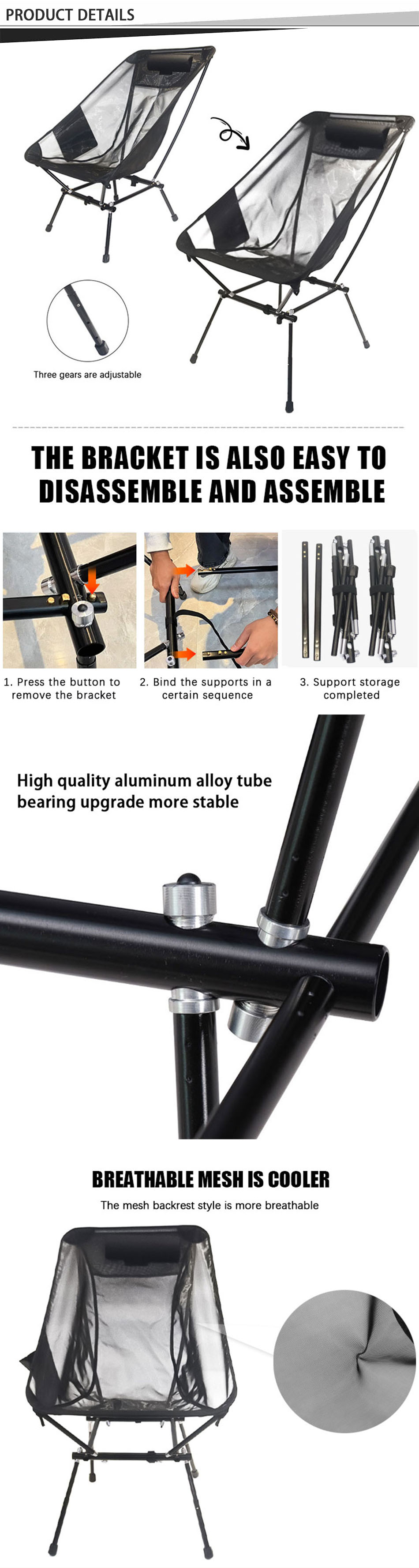 상표 : 안후이 파이스텔 공장 제조업과 관련 : OEM 및 ODM 제품 : 이 야외용 접이식 알루미늄 프레임 캠핑 의자는 조절 가능한 등받이와 가볍지만 견고한 디자인을 자랑하며, 캠핑, 해변 여행, 피크닉, 야외 휴식에 휴대하기 편리하고 편안함을 제공합니다.