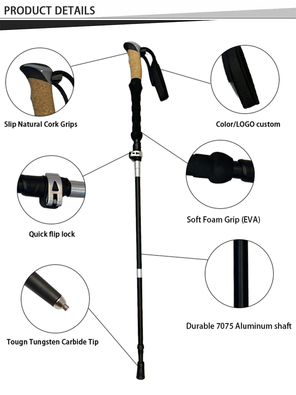 제품 : 접이식 7075 알루미늄 트레킹 폴은 높이 조절이 가능하고, 내구성이 뛰어나면서도 가벼운 구조에 편안한 코르크 손잡이가 있어 하이킹, 걷기, 야외 활동 시 안정적인 지지력을 제공합니다.