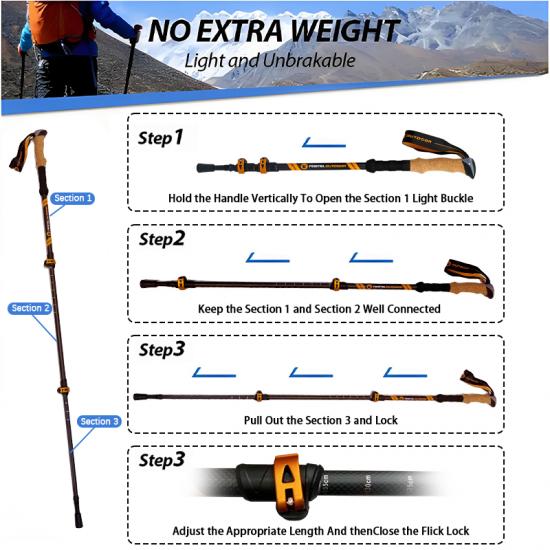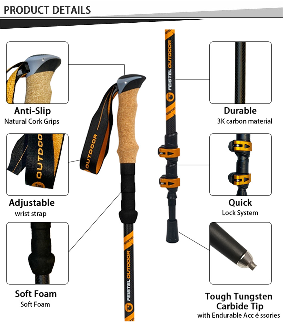 제품 : 천연 코르크 손잡이와 EVA 연장대를 사용하여 맞춤 제작된 경량 야외 등산 스틱은 편안함, 안정성 및 내구성을 제공하며 트레킹, 등반 및 장거리 하이킹에 믿을 수 있는 지지력을 제공합니다.