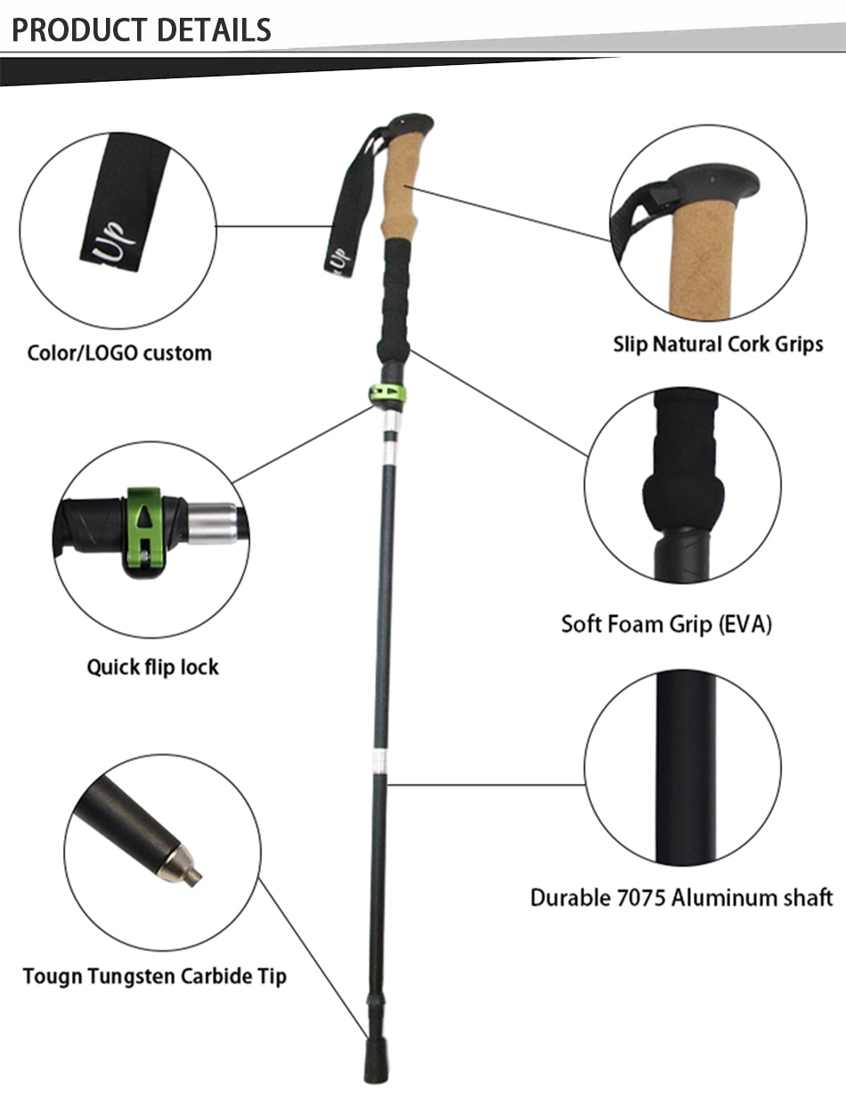 제품 : 공장 직판 가격의 캠핑용 알루미늄 합금 초경량 접이식 트레킹 폴은 길이 조절이 가능하고 접이식 디자인으로 견고하고 가벼운 지지력을 제공하여 하이킹, 캠핑 및 야외 활동에 적합합니다.