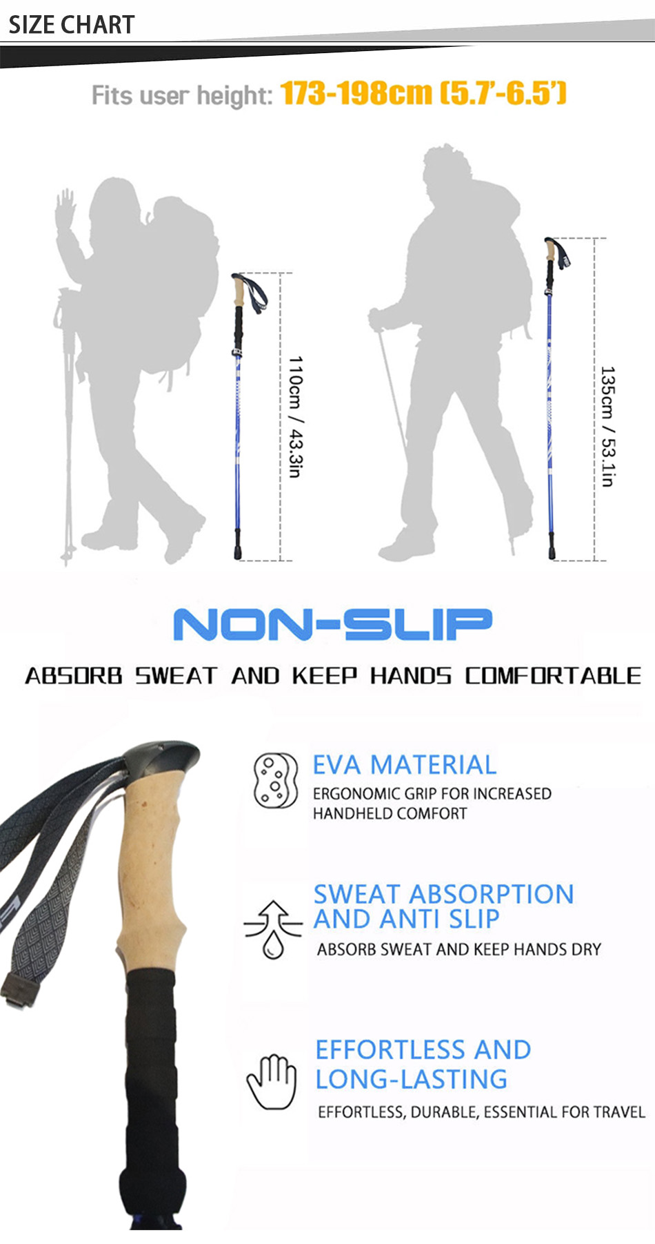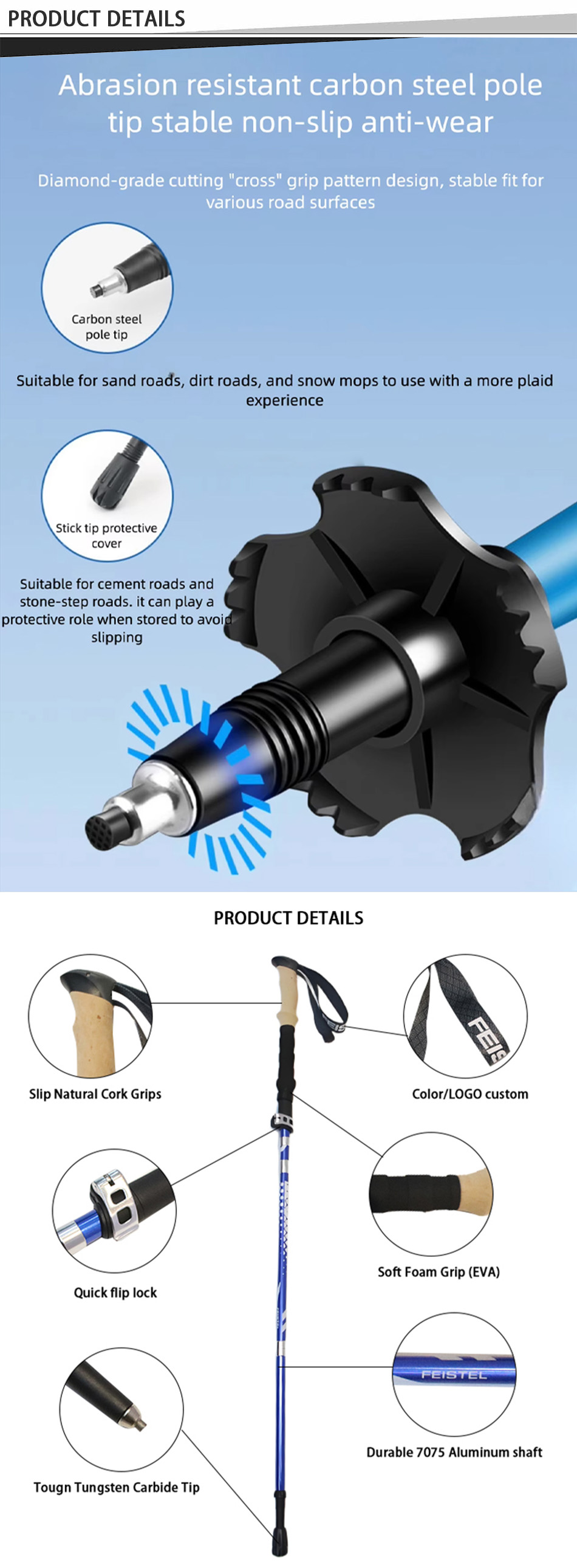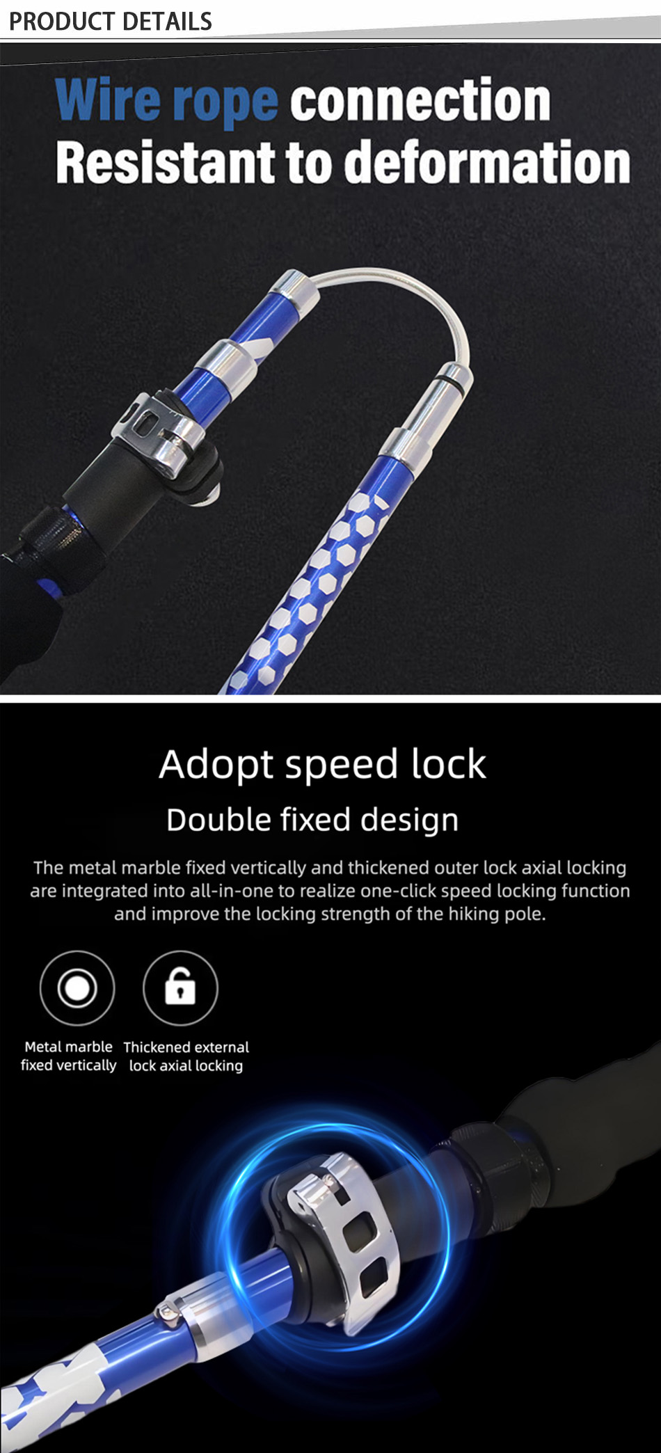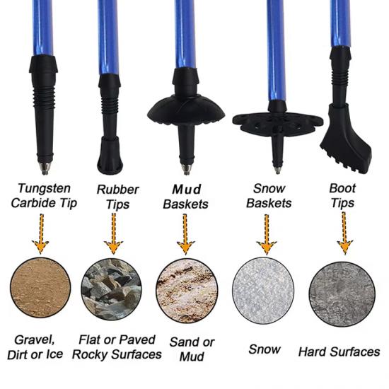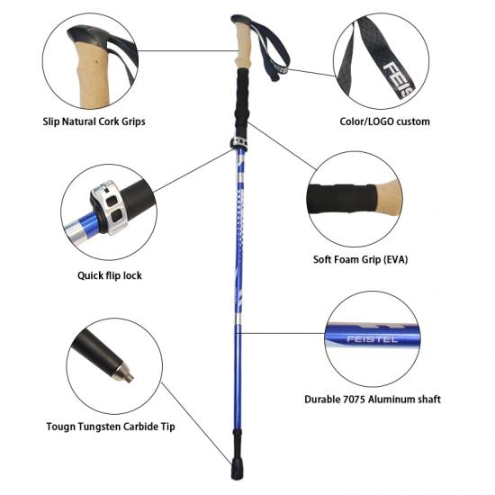 제품 : 5단 접이식 트레킹 폴은 초경량 7075 알루미늄 소재와 견고한 외부 잠금 시스템을 갖추고 있어 야외 하이킹 및 트레킹 모험에 필요한 안정성, 강도 및 휴대성을 제공합니다.
