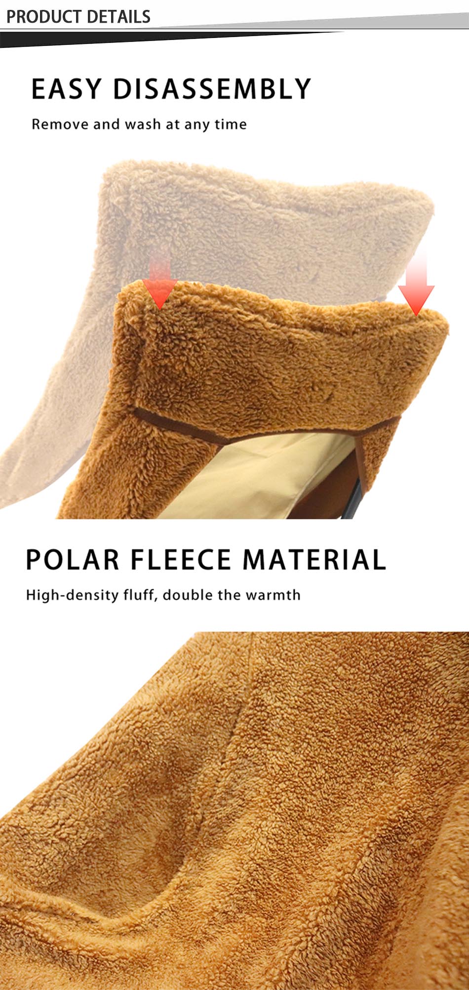 제품 : 플리스 소재의 캠핑 의자 보온 커버는 탈착식으로 되어 있어 포근하고 따뜻한 온기를 제공하며, 캠핑 의자에 쉽게 씌울 수 있어 서늘한 날씨에 야외에서 편안하게 휴식을 취하기에 이상적입니다.