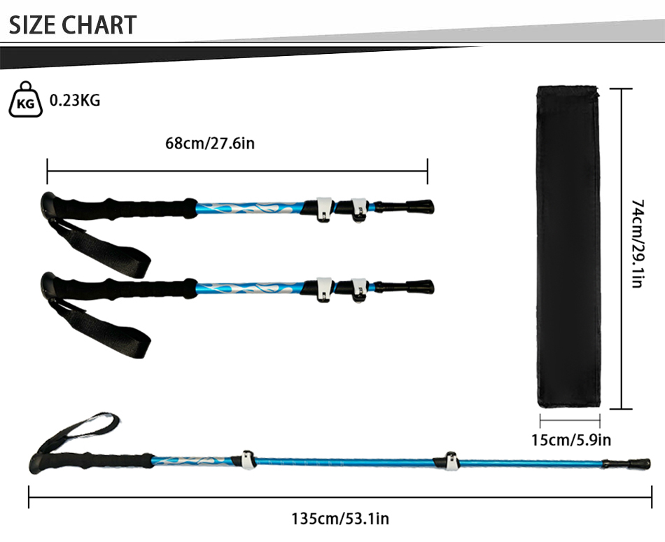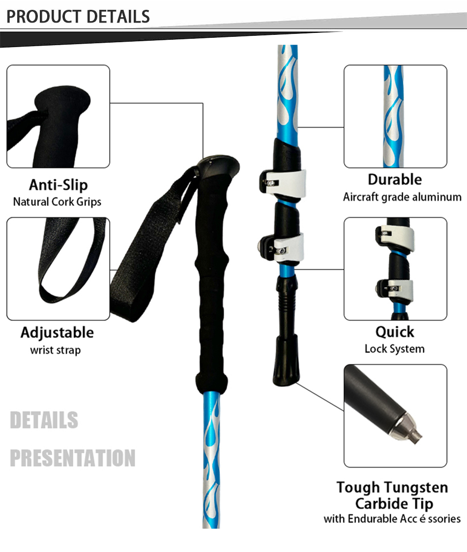 제품 : 고강도 초경량 조절식 텔레스코픽 트레킹 폴은 내구성이 뛰어난 텅스텐 스틸 팁과 편안한 EVA 손잡이를 갖추고 있어 하이킹, 트레킹 및 야외 활동에 안정적이고 믿을 수 있는 지지력을 제공합니다.