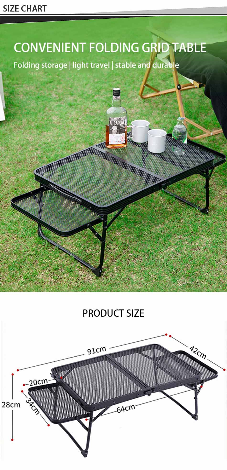 제품 : 현대적인 캠핑용 금속 메시 야외 접이식 테이블은 가벼운 철제 프레임, 내구성 있는 메시 표면, 쉬운 이동성과 안정성을 갖추고 있어 바베큐, 피크닉, 야외 모험에 적합합니다.
