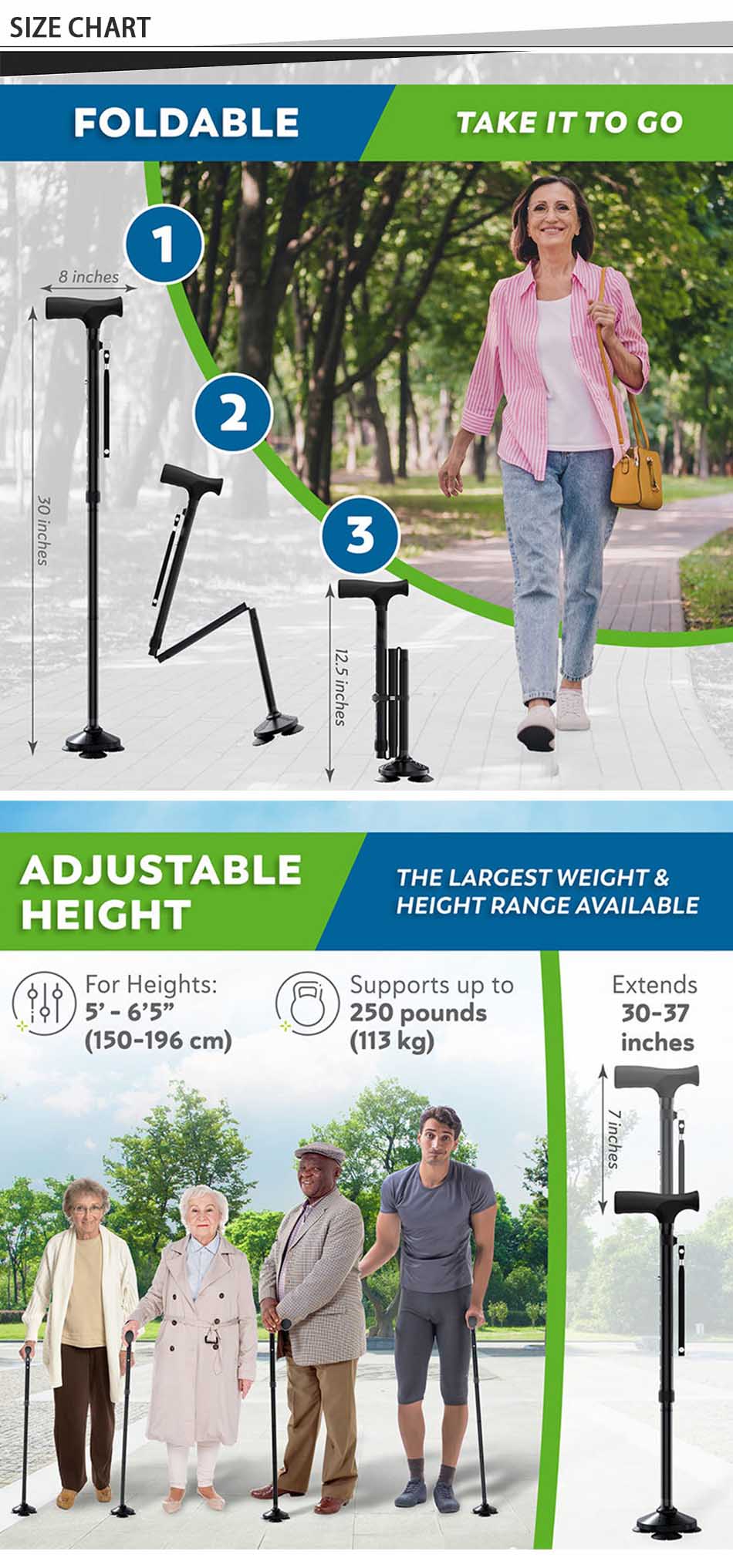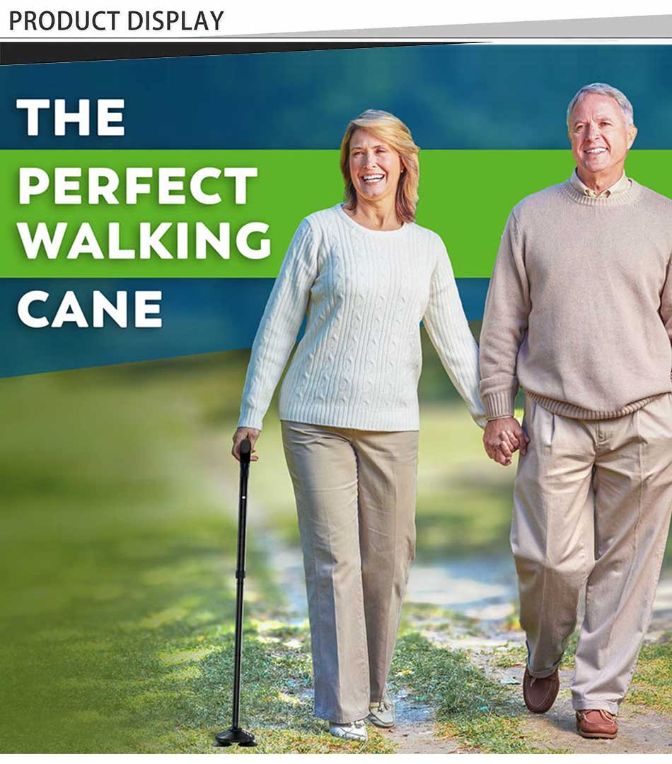 제품 : 새롭게 출시된 노인용 지팡이는 접이식 디자인, 편안한 T자형 손잡이, 안정적인 미끄럼 방지 받침대, 그리고 내구성 있는 구조를 갖추고 있어 노인분들이 야외에서 균형감각, 안전성, 그리고 보행 보조 기능을 향상시켜 줍니다.