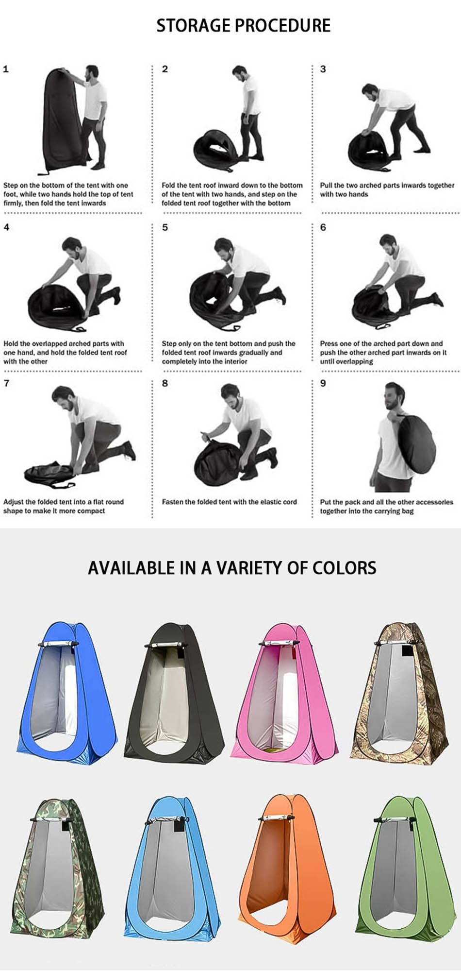 제품 : 이 야외 캠핑용 휴대용 팝업 샤워 텐트는 옷을 갈아입거나, 옷을 갈아입거나, 화장실 텐트로 사용할 때 즉각적인 프라이버시를 제공합니다. 가볍고, 설치가 쉽고, 다재다능합니다.
