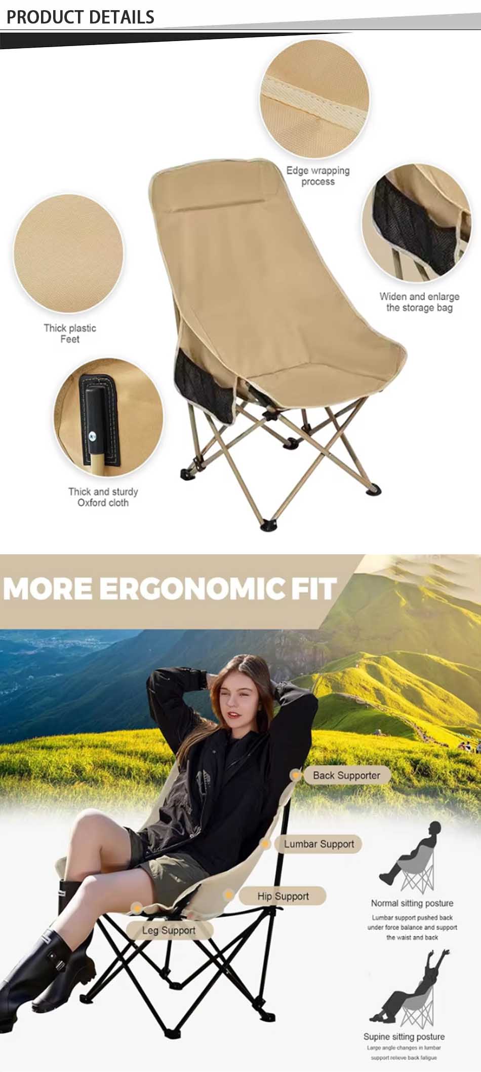 상표 : 안후이 파이스텔 공장 제조업과 관련 : OEM 및 ODM 제품 : 이 야외용 접이식 알루미늄 프레임 캠핑 의자는 조절 가능한 등받이와 가볍지만 견고한 디자인을 자랑하며, 캠핑, 해변 여행, 피크닉, 야외 휴식에 휴대하기 편리하고 편안함을 제공합니다.