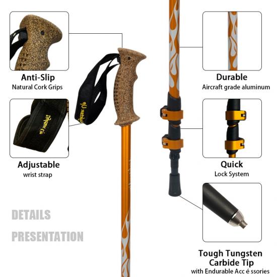 제품 : 휴대가 간편하고 높이 조절이 가능한 항공 등급 알루미늄 트레킹 폴은 내구성이 뛰어난 구조, 편안한 고무 손잡이, 교체 가능한 팁 액세서리를 갖추고 있으며, 걷기, 하이킹, 트레킹 및 야외 활동에 안정적인 지지력을 제공합니다.