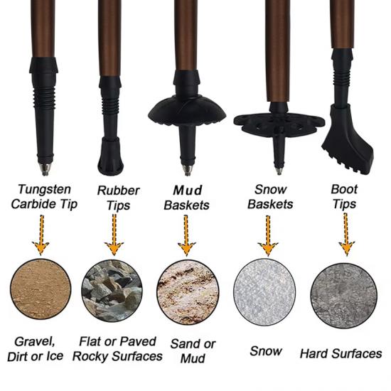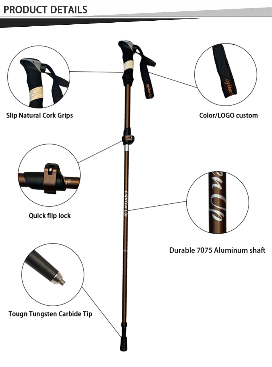트레킹 폴은 아웃도어 스포츠의 좋은 도우미로서 보행의 안정성을 높이고 다리에 가해지는 부담을 줄이는 등 야외 등산 활동에 많은 이점을 가져올 수 있습니다. 탄소 섬유 및 알루미늄 합금 트레킹 폴과 3-섹션 및 4-섹션 트레킹 폴이 있습니다.