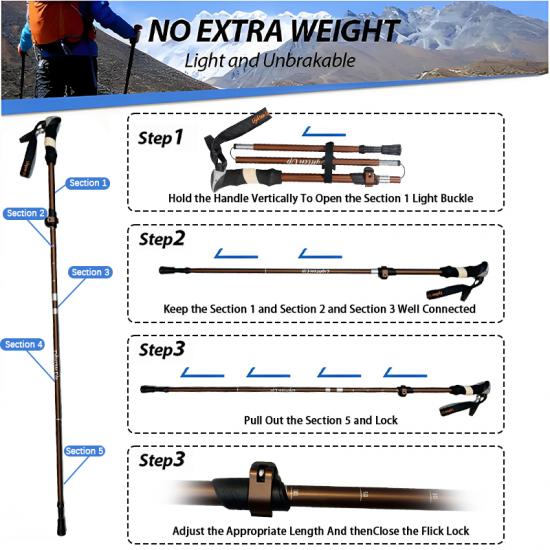 제품 : 초경량 6061 알루미늄 합금 소재의 5단 접이식 트레킹 폴은 조절 가능한 안정성, 내구성 있는 디자인, 편안한 EVA 손잡이를 제공하여 야외 활동 시 안정적인 지지력을 제공합니다.
