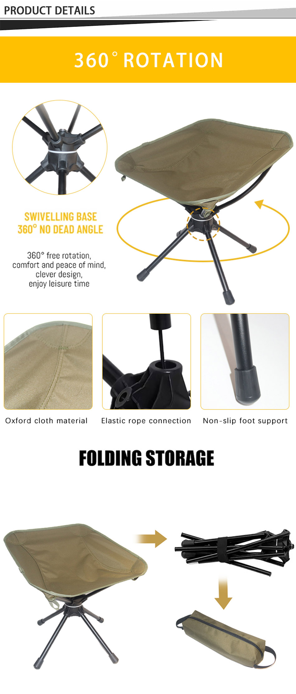 제품 : 이 초경량 휴대용 야외 360도 회전 의자는 해변 캠핑과 낚시에 적합하며, 편안한 야외 활동을 위해 편안함, 안정성, 손쉬운 회전을 제공합니다.